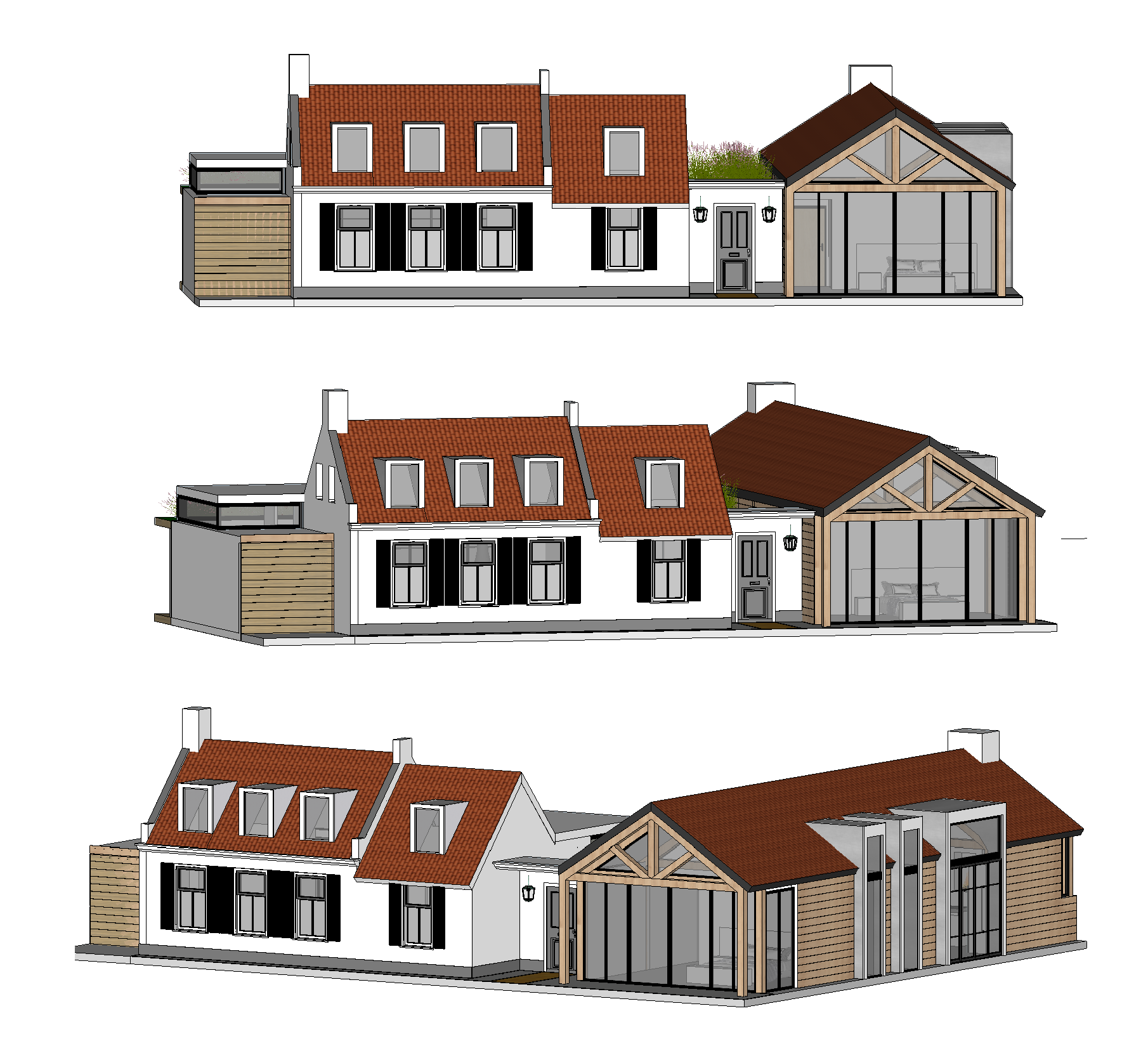 Een bijzonder project wat in de steigers staat; een gehele renovatie en uitbouw van een huis in een pittoreske vestingstad. Ontwerp en realisatie moeten vallen binnen de plaatselijke regelgeving voor monumenten. De opdracht is om zowel de buitenzijde als het interieur te ontwerpen, inclusief een nieuw bijgebouw dat opgetrokken wordt in houtskeletbouw. In nauwe samenwerking met de tuinarchitect wordt straks een project gerealiseerd waarbij woning, bijgebouw en tuin als 1 geheel een nieuwe uitstraling krijgen. Met deze visuals van het ontwerp kun je al een indruk krijgen.